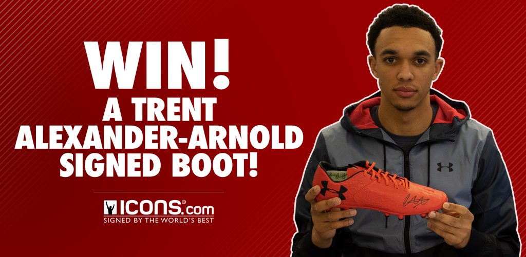 The prize is 1 x Trent Alexander-Arnold Signed Red Under Armour Boot (Icons.com SKU ICTAAB1), which comes complete with an official Icons.com Certificate of Authenticity. The COA shows Trent with the boot in question as well as providing the date and location at which the boot was signed – so you can be sure this is the real deal! For more information, check out the boot on Icons.com.