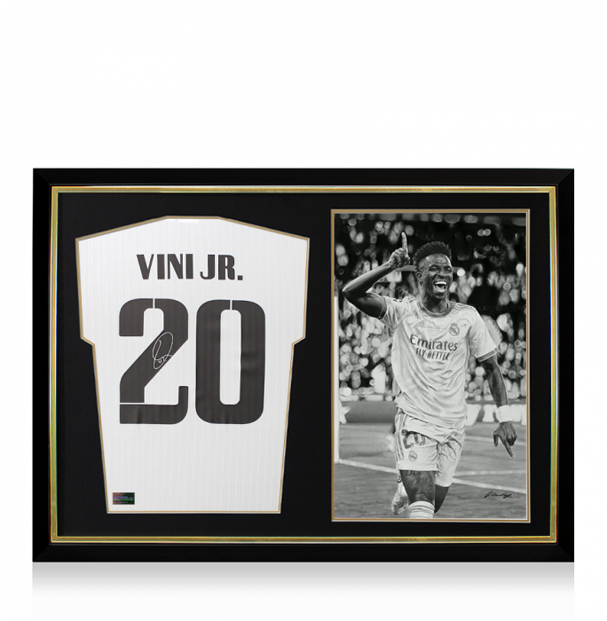 Vinicius Jr Back Signed Real Madrid Modern Home Shirt and Original Artwork In Hero Frame: Limited Edition 1/1